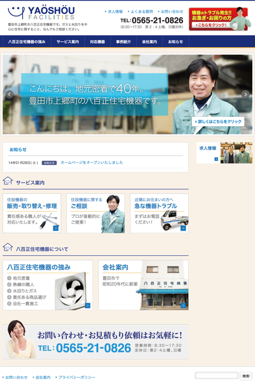 八百正住宅機器 http://yaoshou.jp/ クライアント名 有限会社八百正住宅機器 制作 株式会社ルーコ 制作メンバー ディレクター・デザイナー・a-blog cms 構築:水野 コーディング:costadelsol 有限会社八百正住宅機器さまの新規ホームページ制作を、a-blog cmsで行いました。テンプレート「site2013」をベースにカスタマイズしました。 #その他
