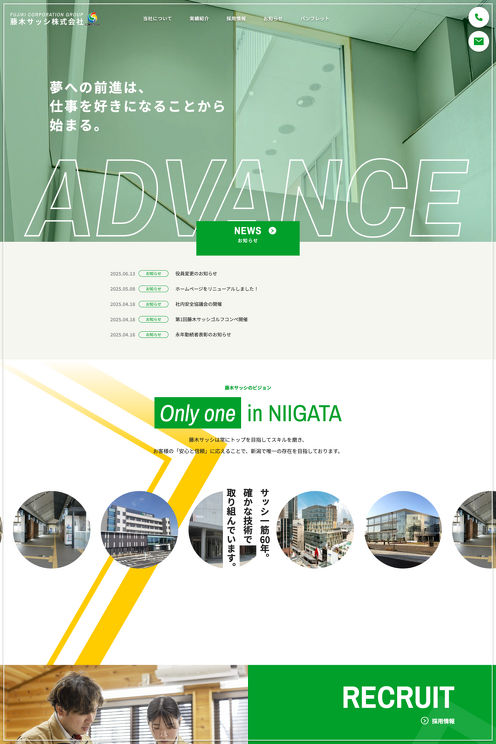 藤木サッシ様は、公共施設を中心としたサッシや外装パネルの施工を手がけており、安全性と高い品質を兼ね備えた確かな技術力には定評があります。県内のさまざまな建設工事において、重要な役割を担っていらっしゃいます。 今回のリニューアルで、実績紹介や採用情報ページの更新作業がより効率的に行えるようになりました。また、社員の皆様が実際に働いている様子を撮影した写真を随所に使用することで、業務内容や社内の雰囲気がよりリアルに伝わるサイト構成を実現しています。