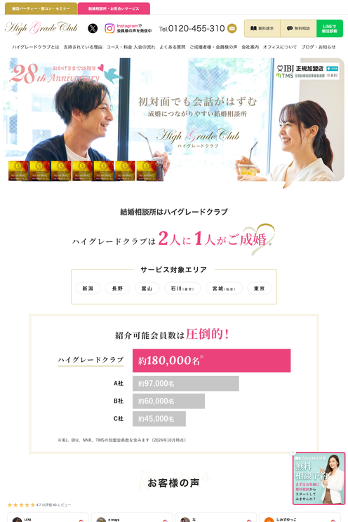 新潟市の株式会社アクセス・ネットワーク様は、新潟・長野・富山・金沢・仙台にて結婚相談所の運営やイベント開催に取り組まれています。公開したホームページでは、デザインを一新し、結婚相談所「ハイグレードクラブ」の大事なアピールポイントである「初対面でも会話がはずむ」という点をデザイン上でも表現したいと考え、随所に会話を連想させる吹き出しのモチーフを加えました。