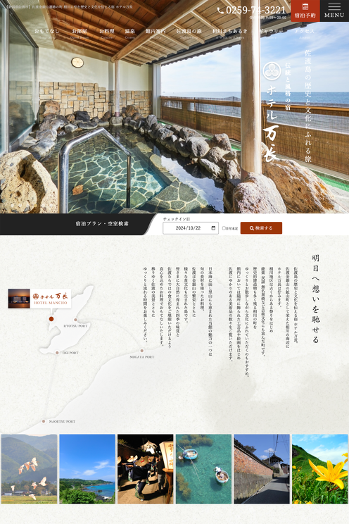 佐渡市のホテル万長様の公式ホームページを制作しました。ホテル万長様は金山の繁栄で鉱山町として栄えた相川地区にあり、日本海と夕日を一望できるお宿です。佐渡の旅ページでは、貴族・武家・町人の文化が融合した佐渡島ならではの魅力を感じていただけるように、歴史・自然・美術・体験と分類して観光スポットを紹介。ギャラリーページで万長様の館内とオリジナルアクティビティ、佐渡の美しい風景写真を大きく見られるようにしました。「smartphoto」の機能で画像を拡大表示するようにしましたが、ユニットIDで判別してそれぞれのグループごとに表示されるように工夫しました。ホテル万長様のサイトを通じて佐渡島について深く知っていただける構成になっています。