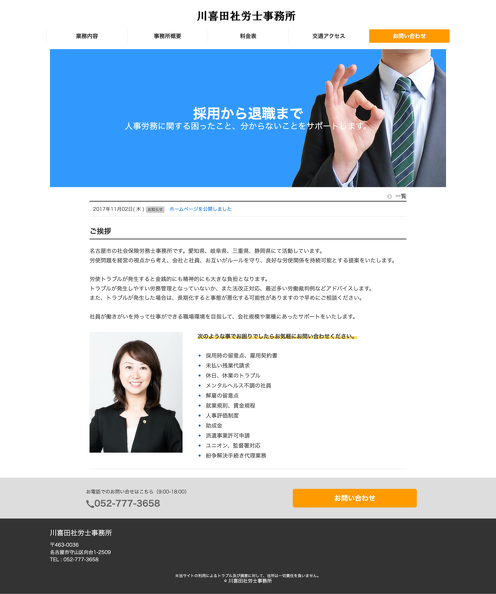 川喜田社労士事務所(名古屋市守山区) http://www.kawakita-sr.com/ クライアント名 川喜田社労士事務所 制作 有限会社シーエスプラス 名古屋市守山区の社会保険労務士である川喜田社労士事務所様では、労使トラブルの対応、さらには未然に防ぐアドバイスをされています。 #その他