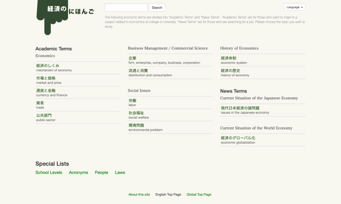 経済のにほんご http://keizai-nihongo.com/ 制作 角南 北斗 大学で経済関係の専門教育を受ける留学生などを対象にした、経済の基本用語を学ぶ日本語学習サイトです。同一のコンテンツを3言語(英語・中国語・韓国語)で提供しています。エントリーにして4000個以上になるデータは、すべてExcelファイルで作成しCSVインポート機能を使ってサイトに反映させています。そのため、エントリーは本文ユニットを持たずカスタムフィールドだけという、やや特殊な形になりました。 #教育・学校