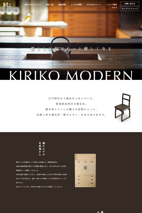 株式会社イシモク様の自社ブランド「桐子モダン」のブランドサイトです。 以前よりBASEを利用したショッピングサイトを運営されていたので、a-blog cmsと連携することでショッピングサイトへの導線を確保しました。