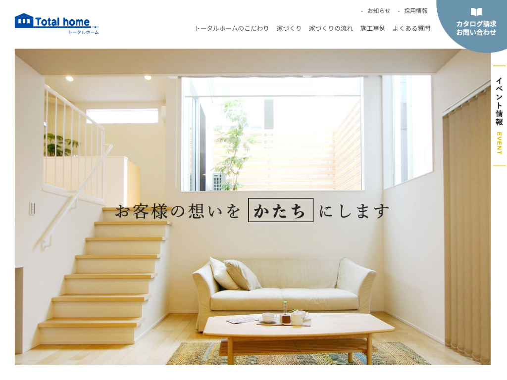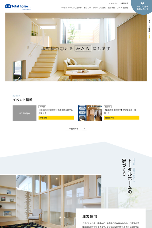 新潟市の有限会社トータルホーム様の公式ホームページを制作しました。トータルホーム様は自社の熟練大工職人による丁寧な仕事で、お客様の理想をかたちにする、真心のこもった家づくりをされています。注文住宅のほか、基本的な間取り以外は自由にアレンジできるセミオーダー住宅が人気です。そうした完成住宅の画像が映えるように、Webサイトカラーはホワイトをベースにブルーグレーを使いシンプルにまとめました。施工事例は簡単に追加・更新ができる仕様になっていて、事例毎に種類やイメージ別のタグ付けをすることで、見たい事例を素早く表示できるようにしています。