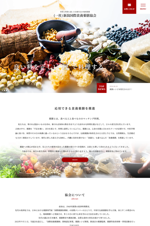 「国際食養薬膳師」資格認定事業のほか、薬膳レシピ開発、飲食店の薬膳監修、薬膳等食育研修・啓発など多方面で活動されています。薬膳に使用される食材の画像をメインに全体的に落ち着いた色合いで、シンプルな構成でまとめました。講座案内・料理教室ページなどの料理画像を差し替えることで、季節感のあるメニューでアピールすることが可能です。