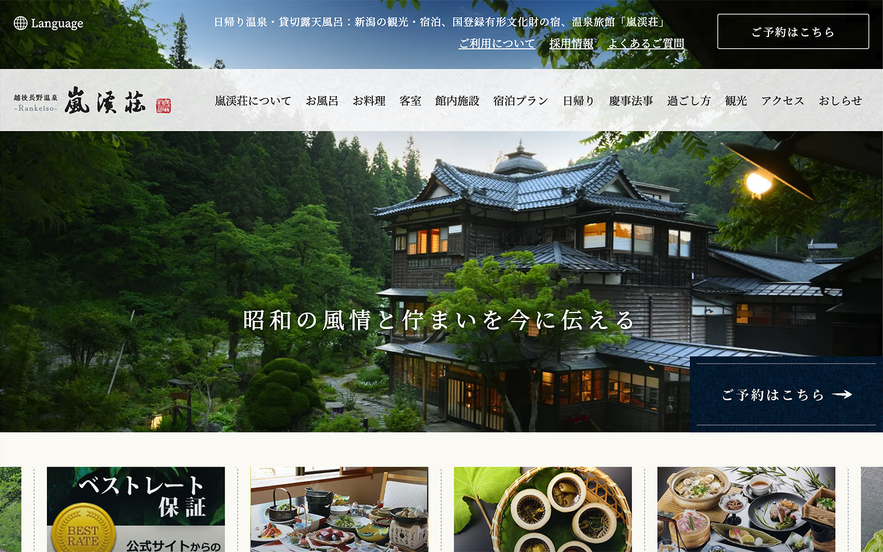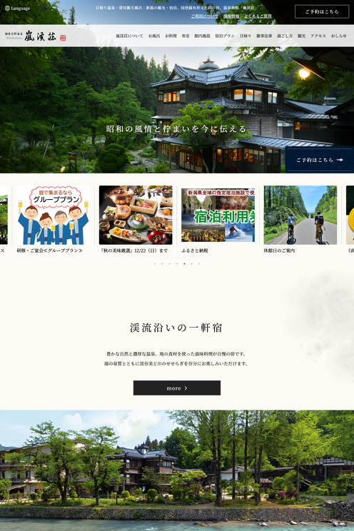 新潟県三条市にある「越後長野温泉 嵐渓荘」様はミシュランガイド新潟版で選ばれた2つ星+の宿泊施設で、風情ある建物は国登録重要文化財となっています。トップページで守門川と建物の外観を撮影した写真を使用するなど、ドラマのロケ地にもなった嵐渓荘様の「渓流沿いに建つ一軒宿」の雰囲気が伝わるデザインを目指しました。また海外の方向けに、英・中・韓の翻訳機能を設置しています。