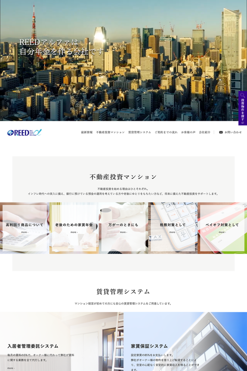 東京都新宿区の株式会社REEDアルファ様の公式ホームページをリニューアルしました。REEDアルファ様は不動産投資が初めての方でも、安心して投資を始められるよう、オリジナルの賃貸管理システムを構築、20代の方から老後資金を検討される方まで幅広い世代のユーザー向けに不動産投資パッケージを提供されています。不動産投資を身近に感じてもらえるように、貯蓄にはない節税メリットや、高利回りになる仕組みを紹介するコンテンツを作成。都市圏の不動産賃料グラフを掲載するなど、視覚的にメリットがわかるようにしています。