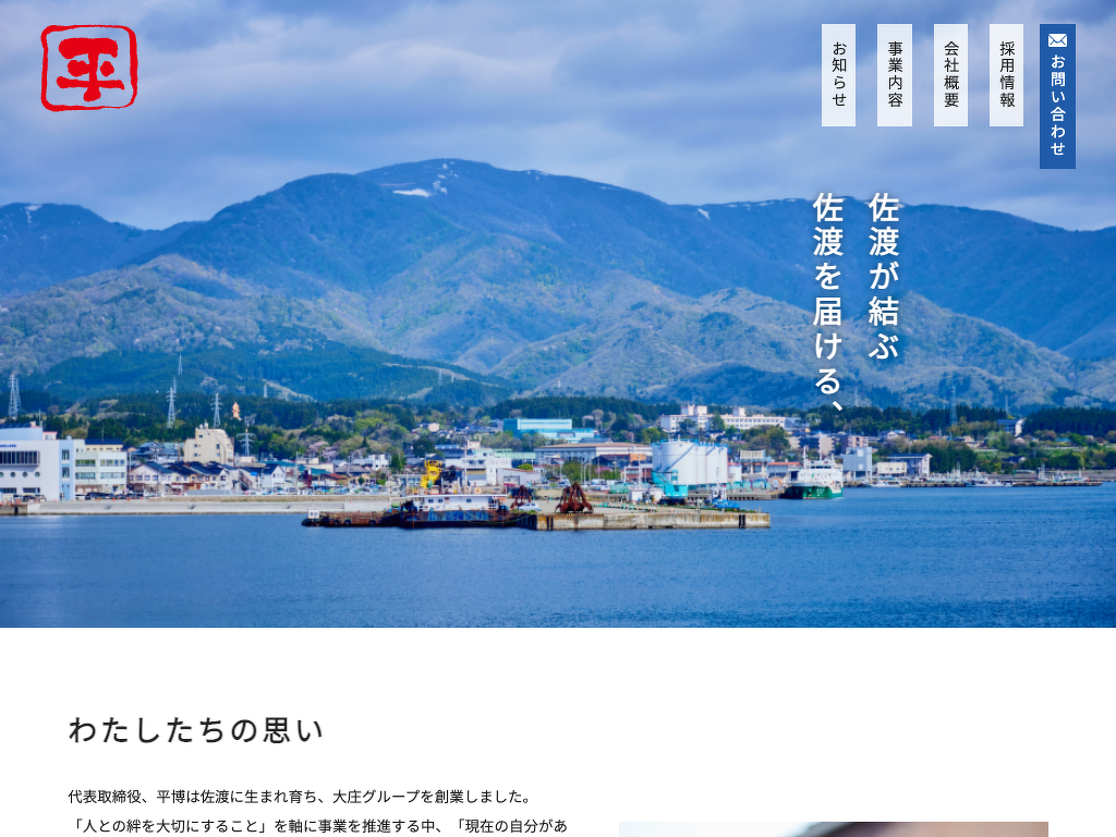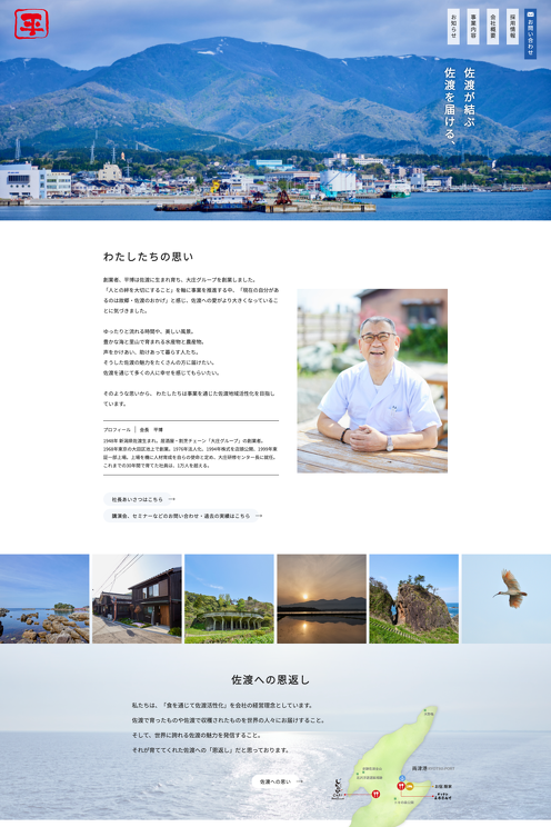 株式会社タイラ様は「佐渡に恩返しをする」という思いから、旬の佐渡産食材を使用した料理や地酒の提供で佐渡ヶ島の活性化に取り組まれています。佐渡を愛する気持ちが伝わるよう佐渡の魅力あふれる写真を随所に使用。タイラ様が経営されている飲食店「キッチンよろこんで」と「じんのびカフェ」のWebサイトについては子ブログを使用して制作しました。