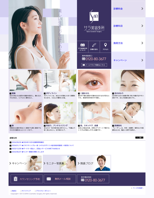 医療法人 蓮玲会 サラ美容外科様のサイトを制作させていただきました。 女性ユーザーをターゲットに、使いやすい、わかりやすい、安心感の与えられるサイトを意識して作成させていただきました。 子ブログとカテゴリの継承、post includeなどCMSの機能を使い、コンテンツを格子状に絡めたページ設計を行いました。複数の入り口を用意し、最終的にカウンセリング予約へと導く動線設計を行いました。