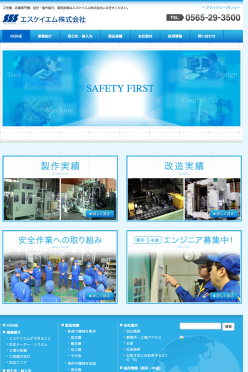 エスケイエム株式会社 http://skm-inc.jp/ 制作 株式会社ルーコ 制作メンバー ディレクター:鈴木ゆ デザイナー:神田 a-blog cms 構築:水野 コーディング:伊藤あゆみ アドバイス:水野 制作の流れは、「a-blog cmsのテーマでプロトタイプを制作→コンテンツの入力→クライアントのチェック→ビジュアルデザイン→CSS装飾によるコーディング」というのがここ最近の定番になってきました。クライアントとの意思疎通しやすく、スムーズに制作が進みました。 #工業メーカー