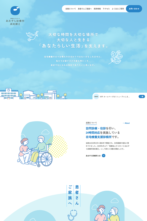 あおぞら診療所 https://soranoiro-aozora.jp/ 代理店名 ナノ・クリエイティブ 制作 HOOP Design 制作メンバー ナノ・クリエイティブ(Planning) HOOP Design(Direction / Design / Engineering) #医療・介護