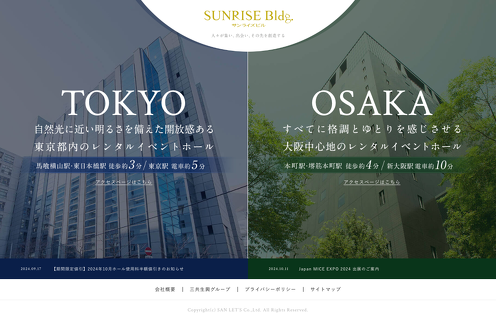 株式会社サン・レッツ様のサンライズビルサイトリニューアルを行いました。サンライズビル様では、東京と大阪でレンタルイベントホールの貸出サービスを提供しています。