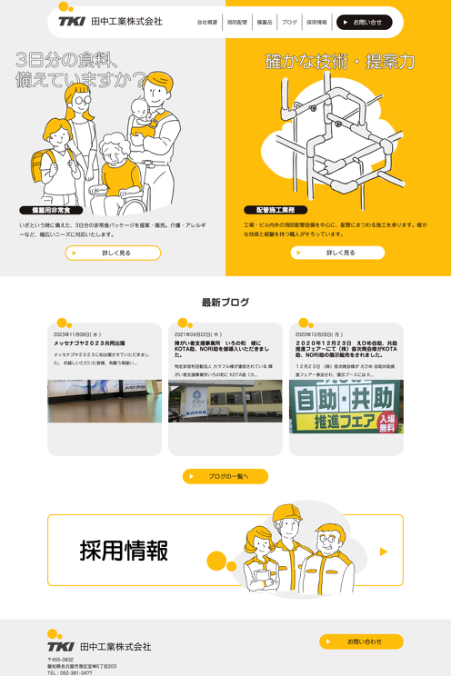 配管施工業が主な業務とされながら、非常時の備蓄品の販売されているということで、施工業の硬いイメージではなく、やわらかく親しみを持ちやすくするため、イラストを取り入れ、黄色を基調としたデザインに仕上げました。
