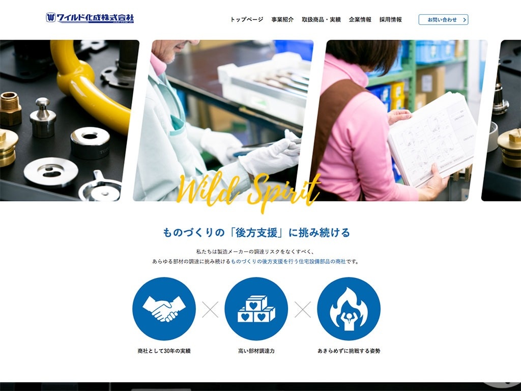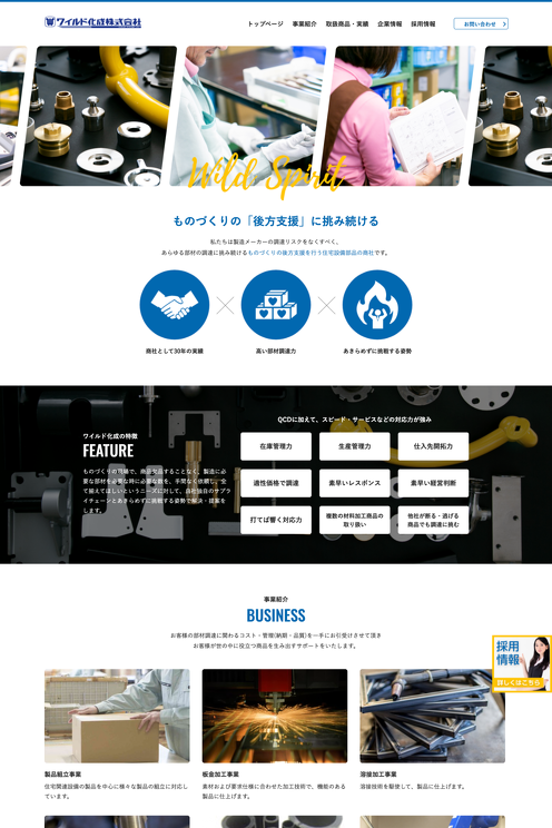ワイルド化成株式会社 https://www.wildkasei.co.jp/ クライアント名 ワイルド化成株式会社 制作 株式会社ワクグミ 福岡県北九州市にある住宅設備部品の商社のコーポレートサイトです。 板金加工、溶接加工、機械加工、ゴム成型など様々な部材・資材の調達管理を通じて、ものづくりの後方支援を行っています。 #工事メーカー