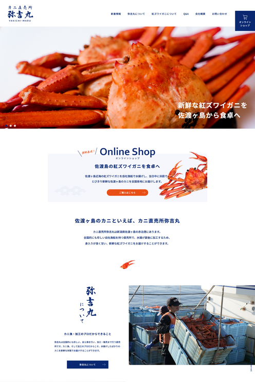佐渡でカニの直売所をされている有限会社弥吉丸様の公式ホームページを制作しました。弥吉丸様が販売されているのは、新鮮な風味・食感が保たれている大変美味しい紅ズワイガニです。ホームページではその紅ズワイガニの美味しさの秘密を丁寧に解説しています。